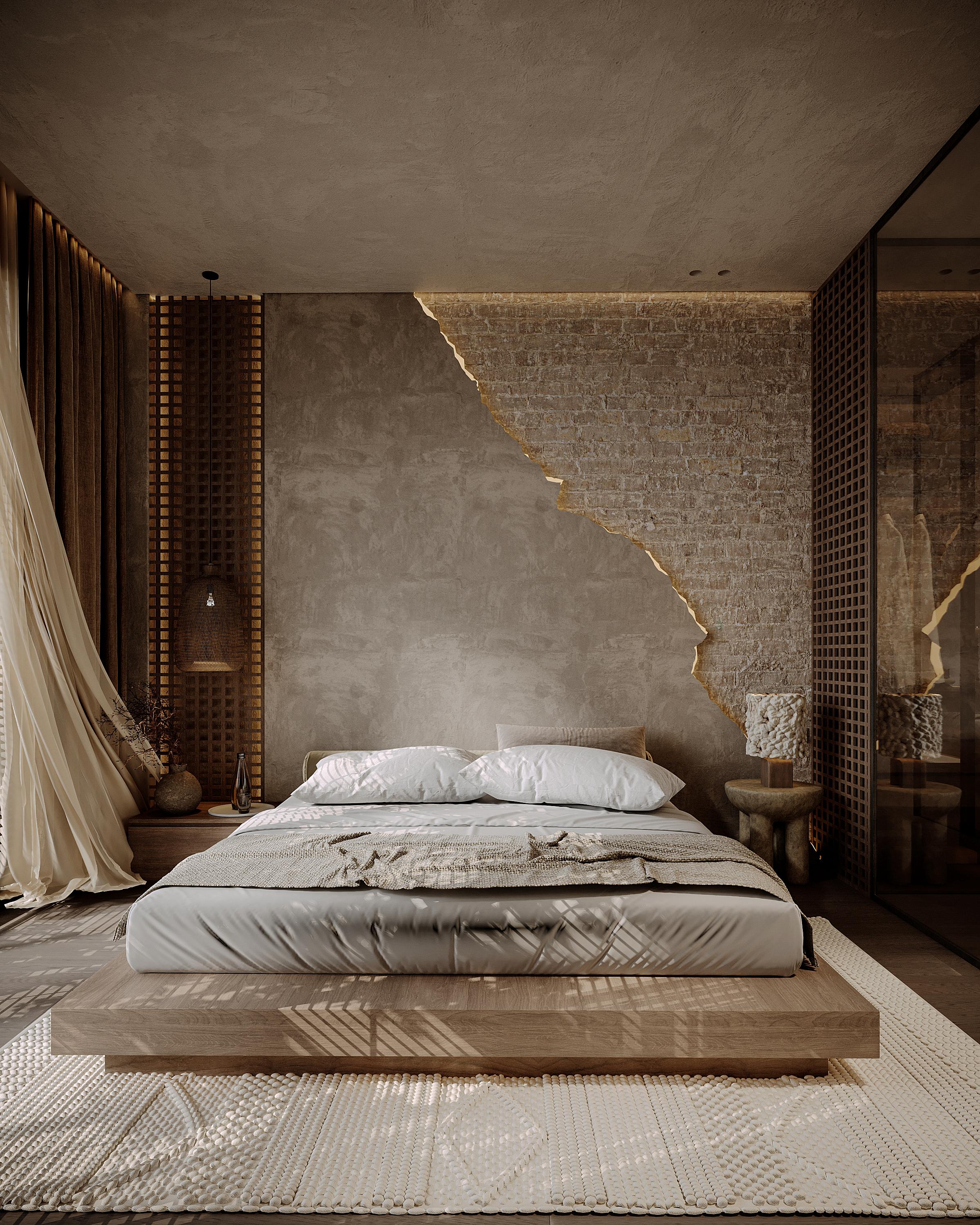 This bedroom embodies a sanctuary of calm, a retreat where natural textures meet modern detailing. It’s designed to inspire peace, relaxation, and timeless sophistication.